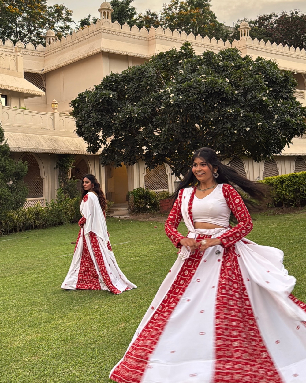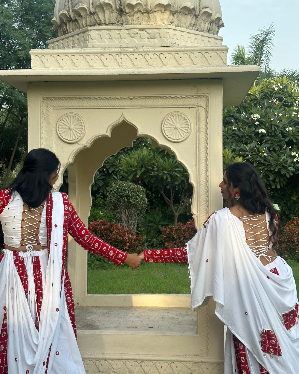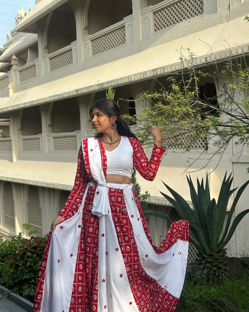Embellished with thread mirror work and full circular flare this lehenga knows to spin and shine.