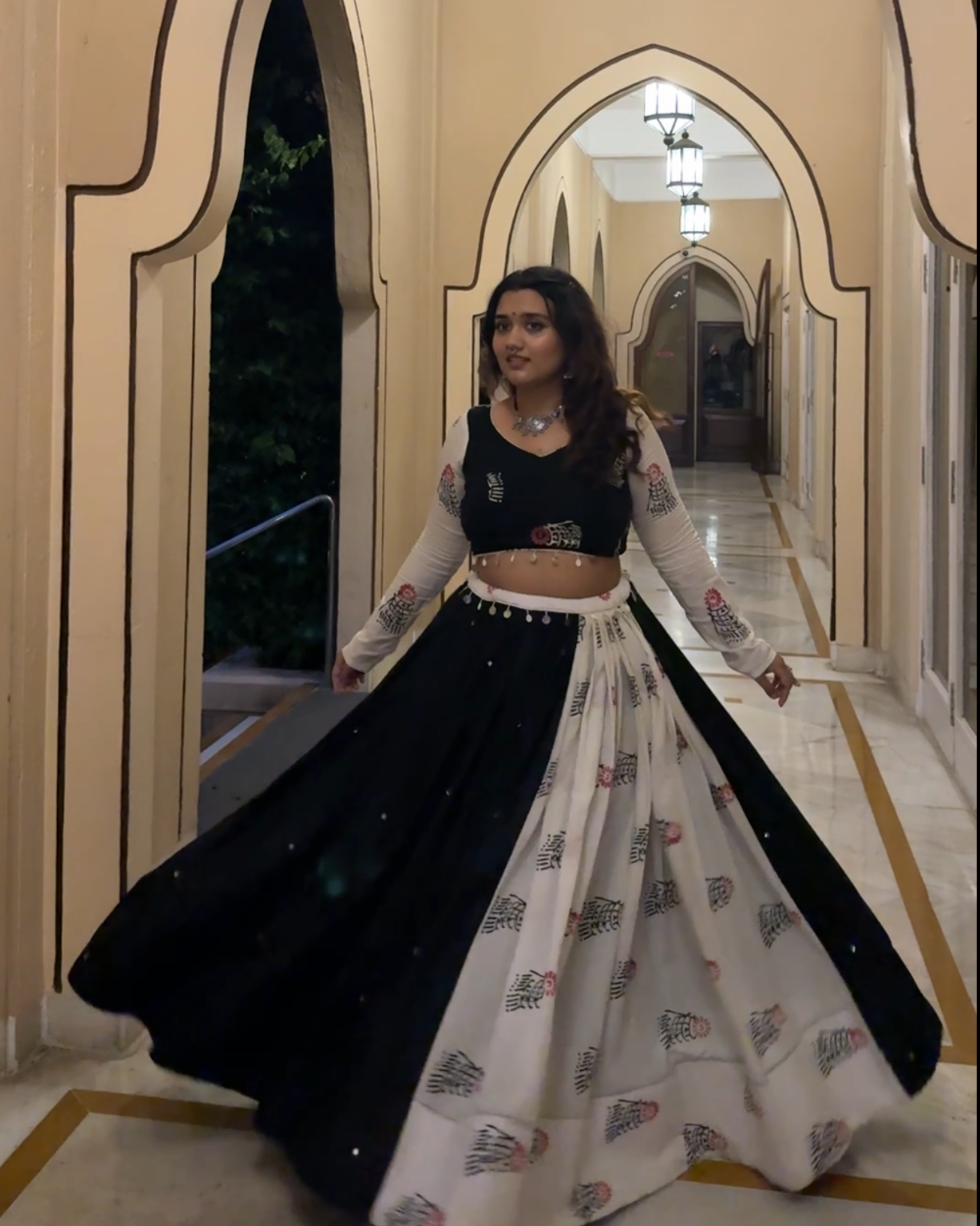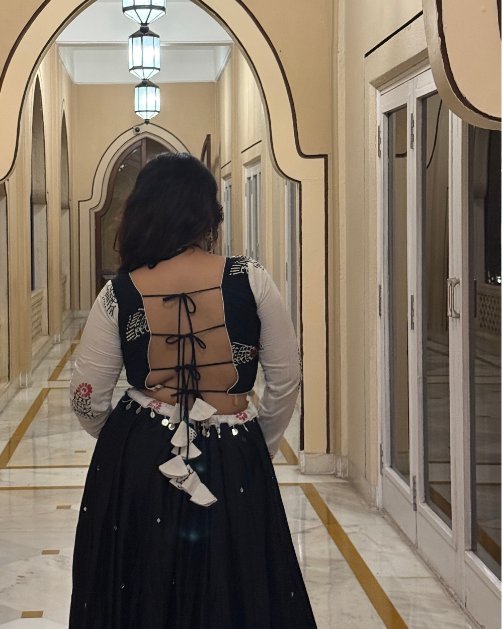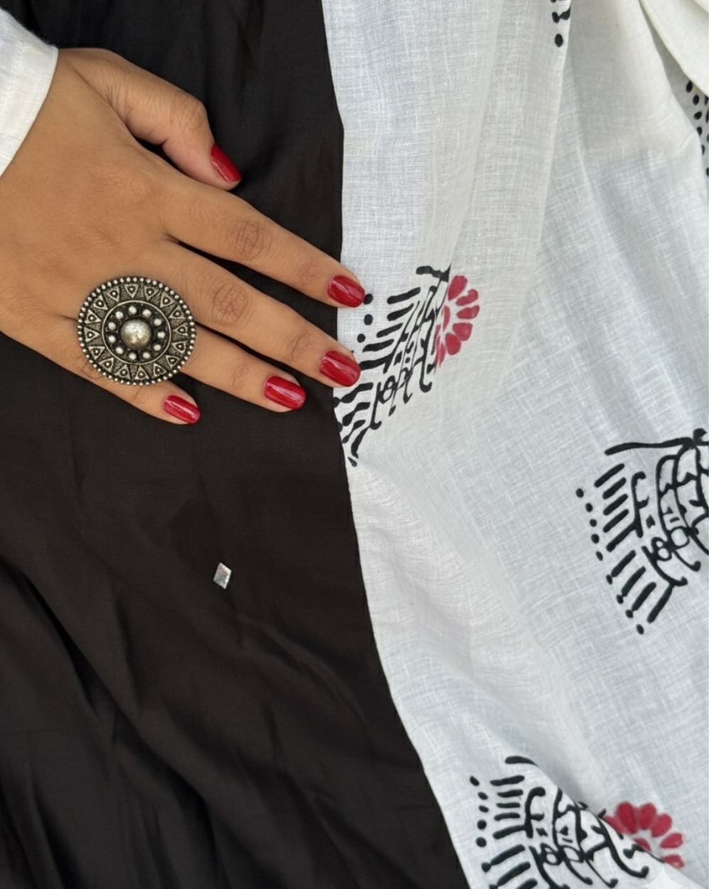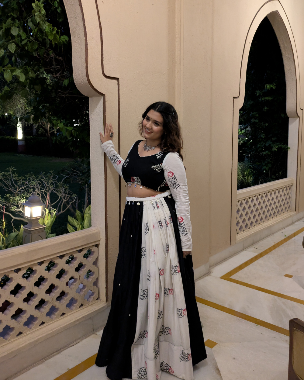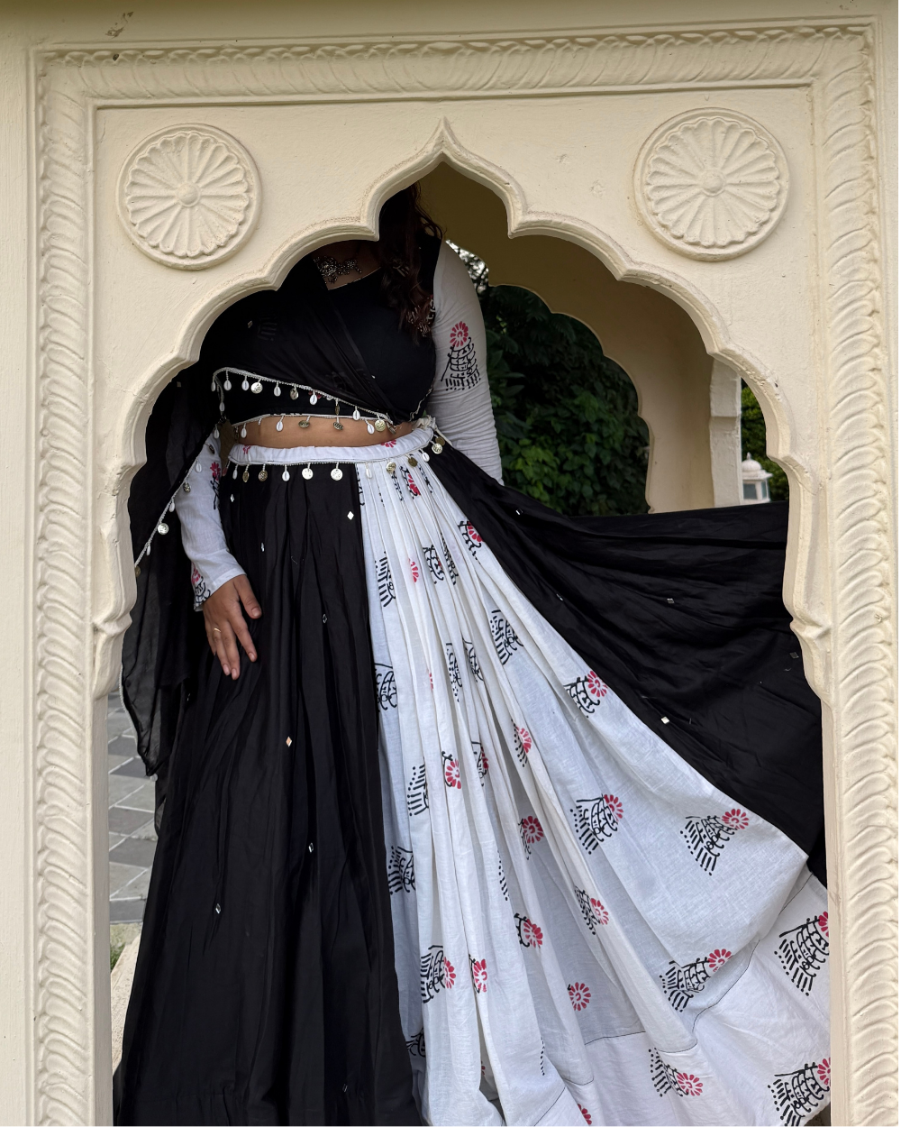 Meet Maaya, A decent contrast featuring single pleated panel of white sanganeri hand block printed mulmul and solid black cotton satin fabric panels.