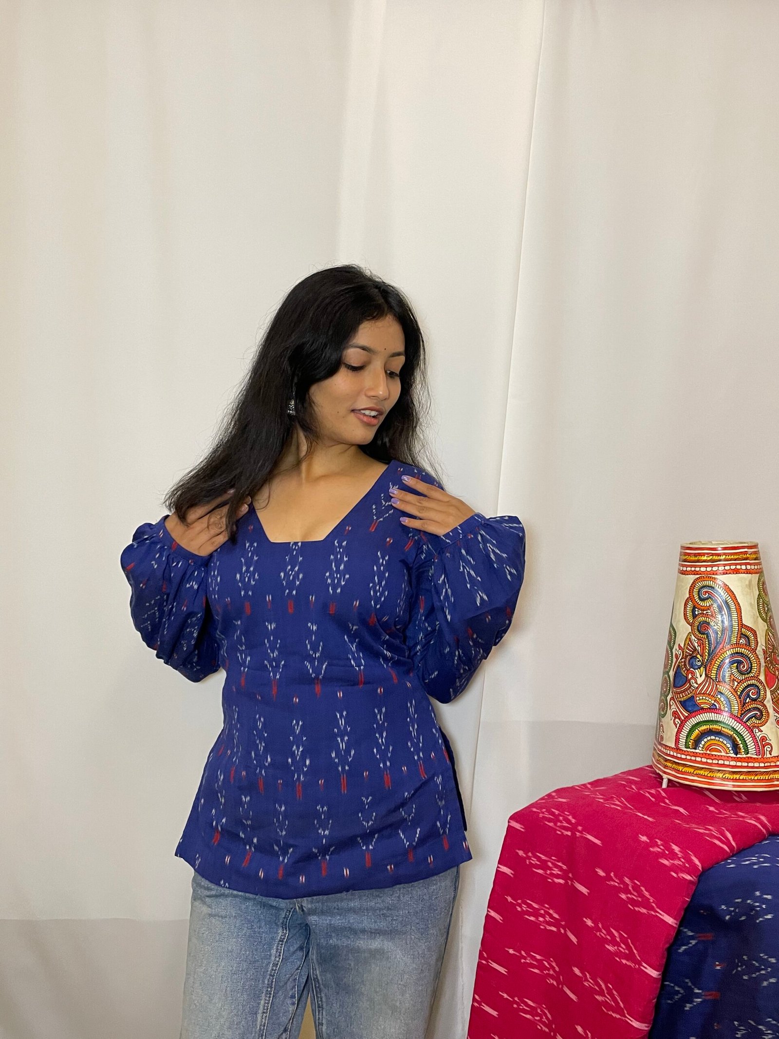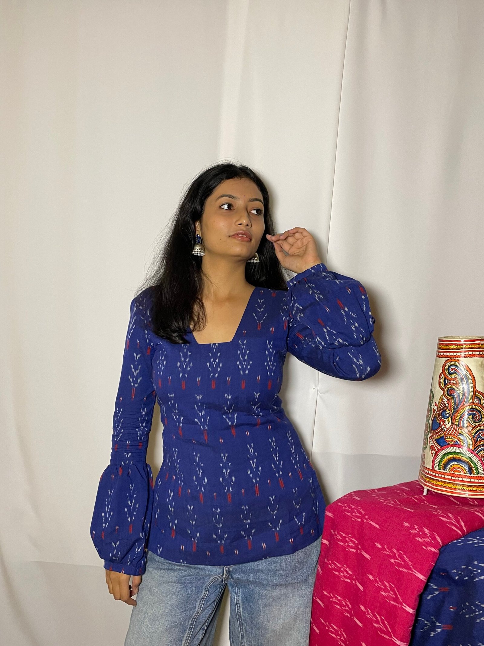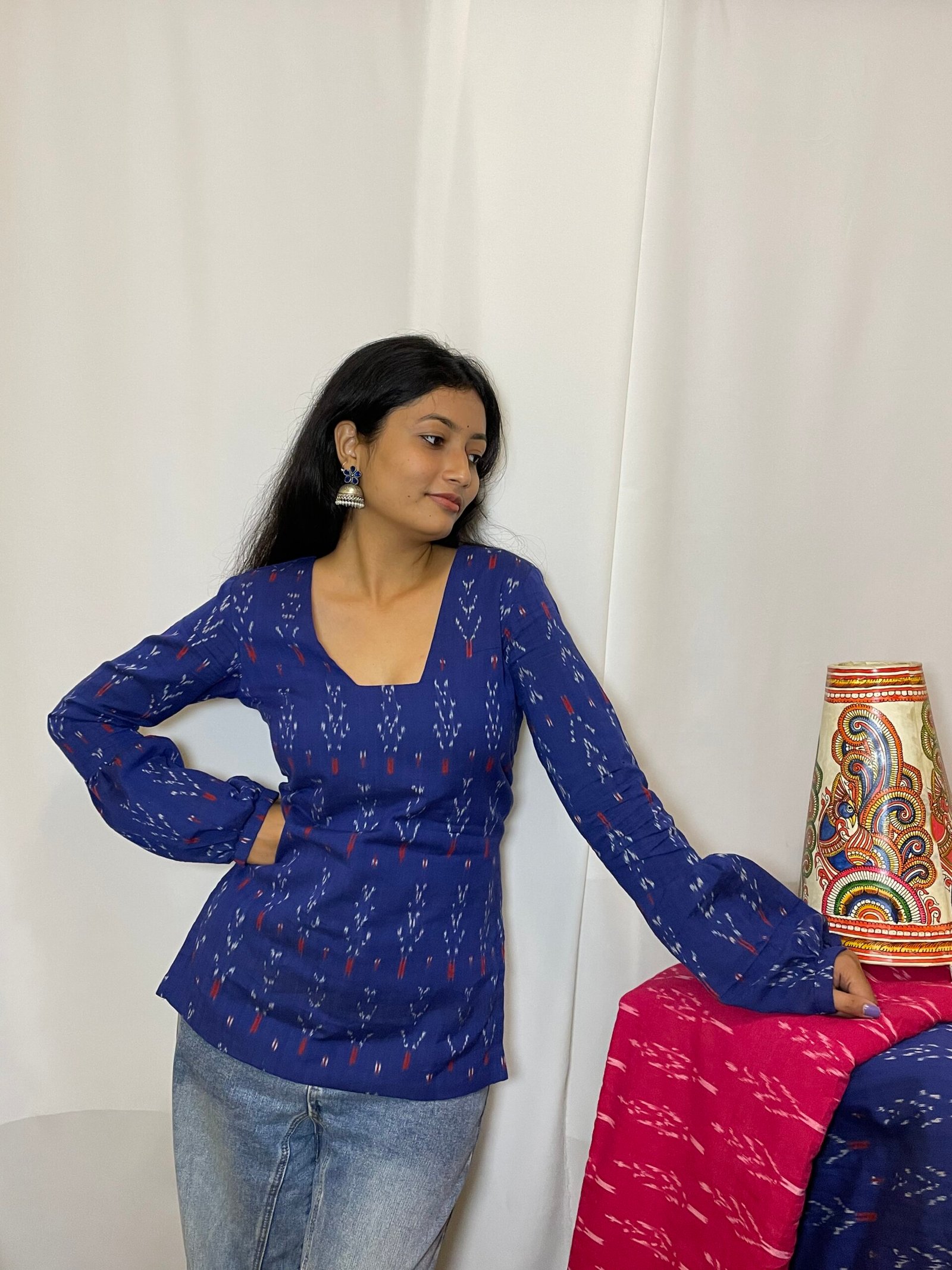 Your new wardrobe crush that is crafted from dreamiest pure ikkat cotton, it’s a whole mood. Dramatic sleeves, bold neckline and snatched up corset back for your perfect winter breezy outings!